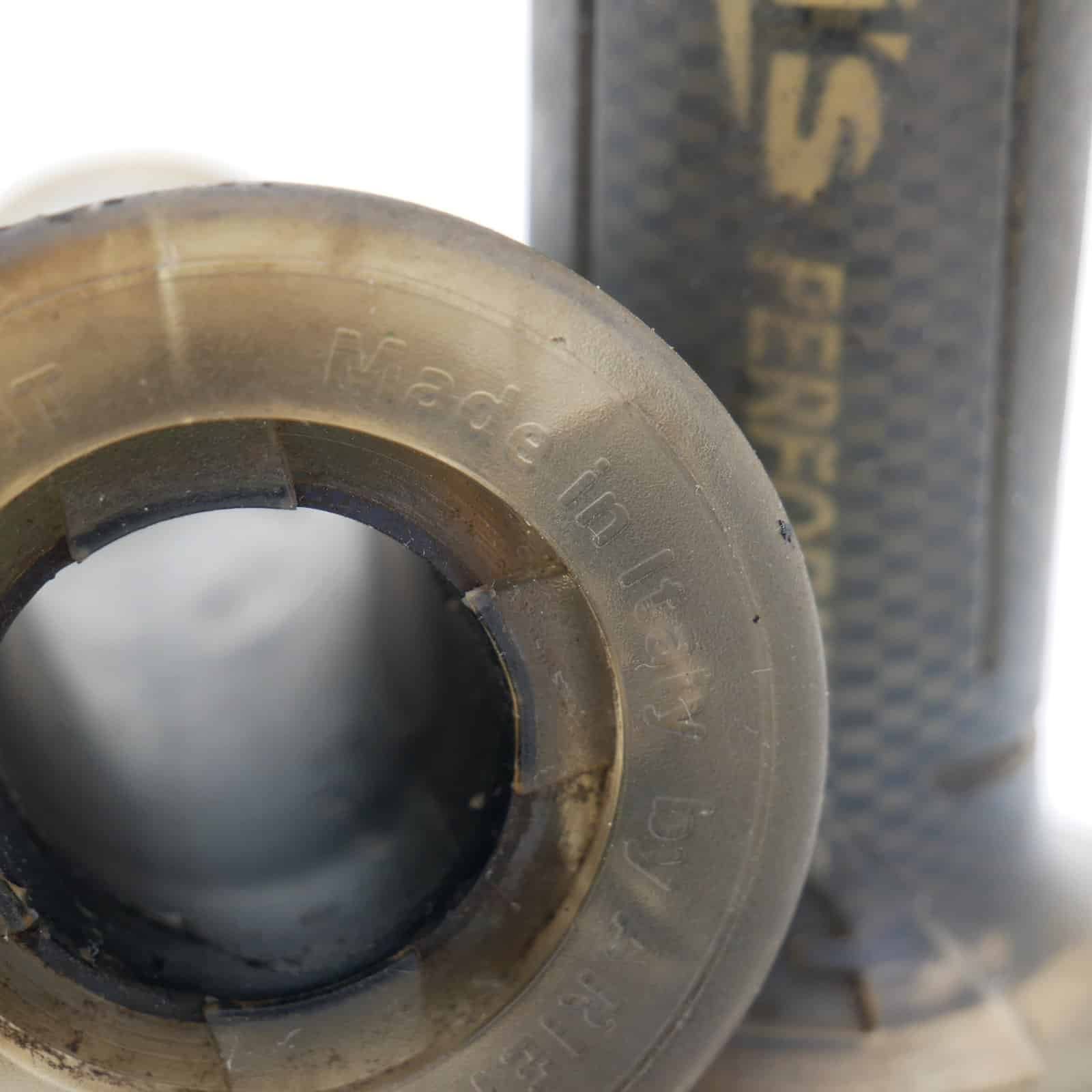 Widoczne ślady użytkowania oraz przebarwienia gumy.